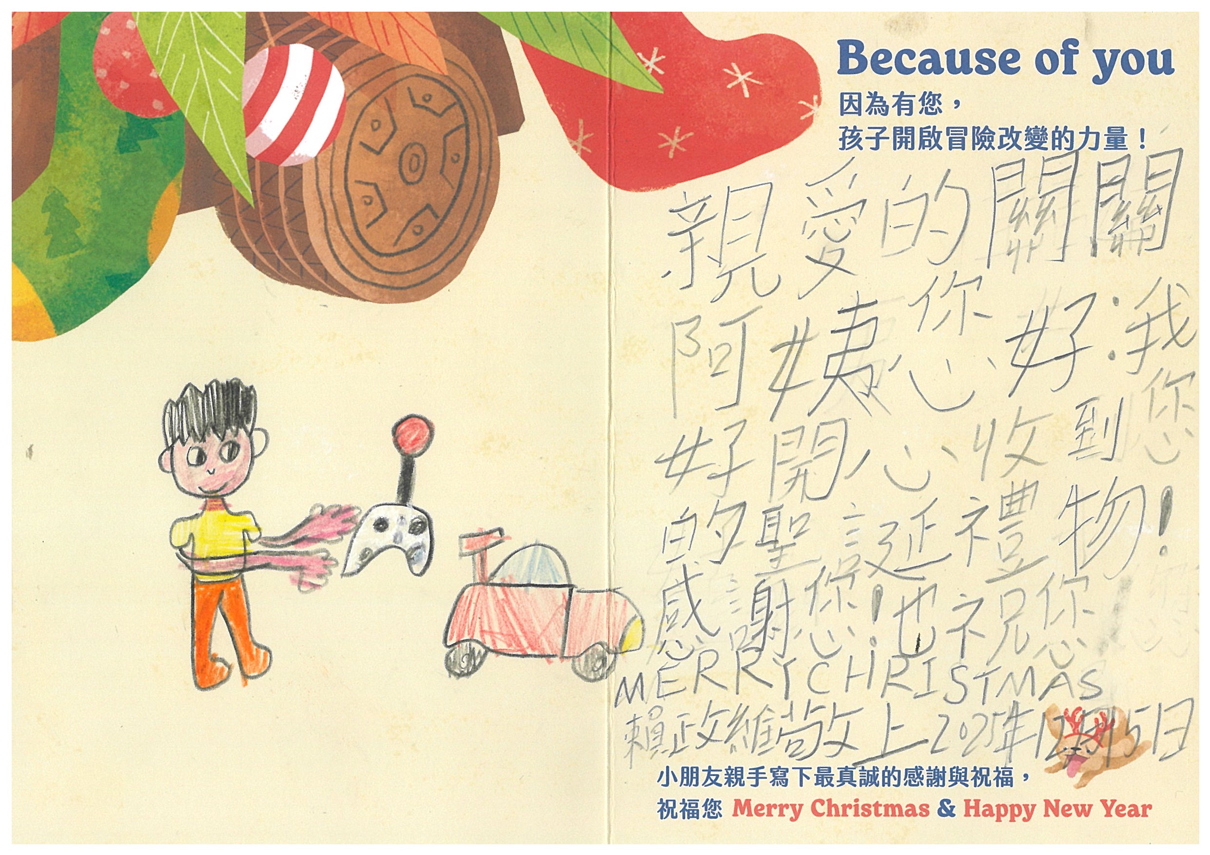 每份聖誕禮物內容:小朋友許下的心願禮物+親手寫下的鼓勵祝福卡片1張