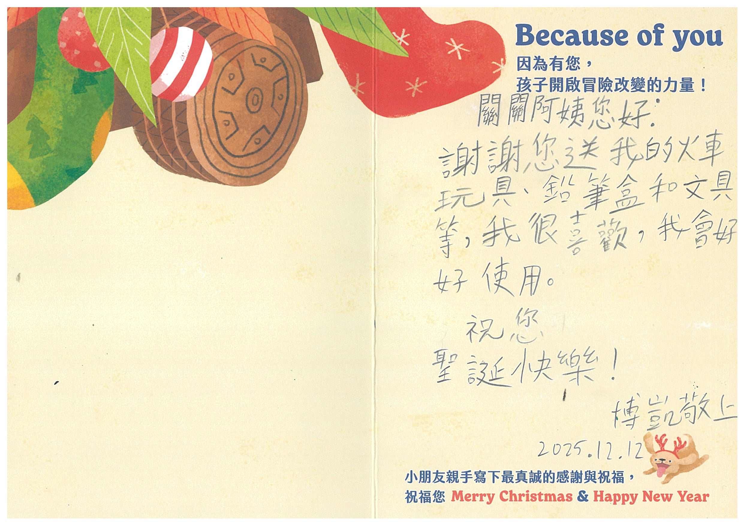 每份聖誕禮物內容:小朋友許下的心願禮物+親手寫下的鼓勵祝福卡片1張