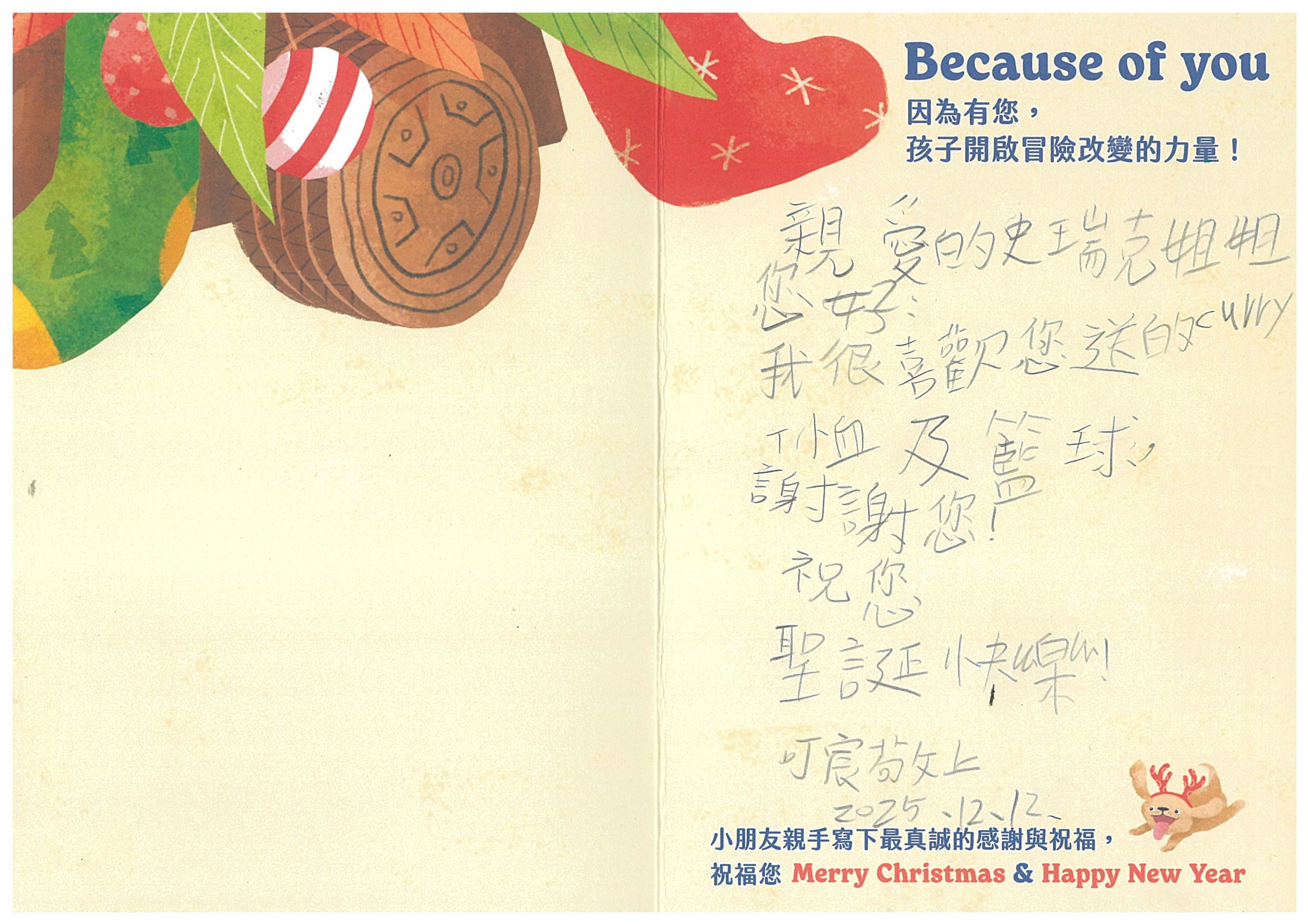 史瑞克 您好:我們已在12/6(六)已將禮物發送到孩子的手上嚕!在發送禮物前, 我們特別為孩子設計〈品格營〉及〈反思課程〉, 最後進行〈冒險小勇者聖誕挑戰賽〉,希望能讓孩子們從心裡面長出勇氣與自信。 特地將小朋友寫給您的感謝卡片掃描成圖檔,記錄這美好的時刻。先前已寄出到孩子寫給您的感謝卡片及我們小小心意的禮物:)
