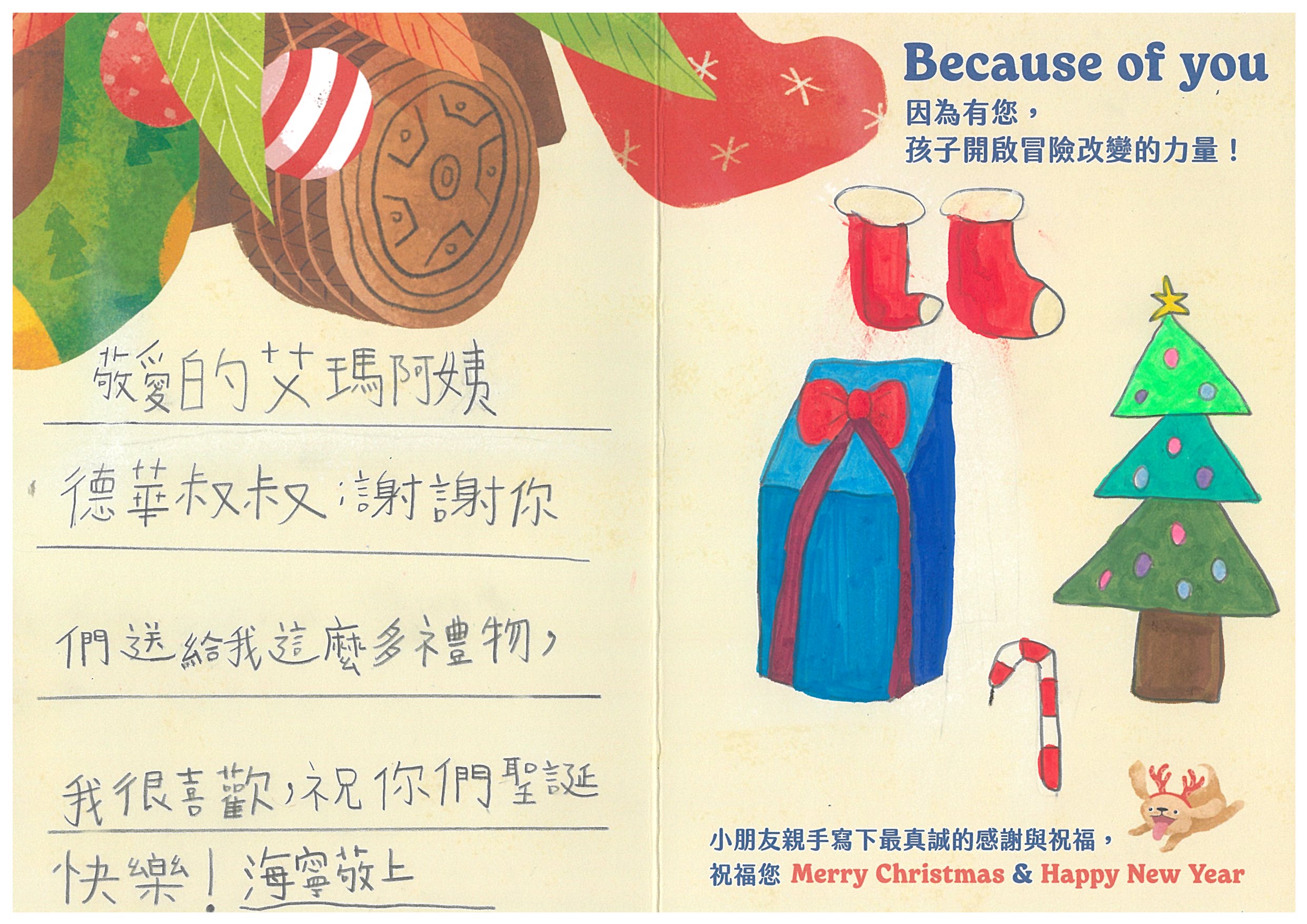 黃艾瑪 您好:我們已在12/6(六)已將禮物發送到孩子的手上嚕!在發送禮物前, 我們特別為孩子設計〈品格營〉及〈反思課程〉, 最後進行〈冒險小勇者聖誕挑戰賽〉,希望能讓孩子們從心裡面長出勇氣與自信。 特地將小朋友寫給您的感謝卡片掃描成圖檔,記錄這美好的時刻。先前已寄出到孩子寫給您的感謝卡片及我們小小心意的禮物:)