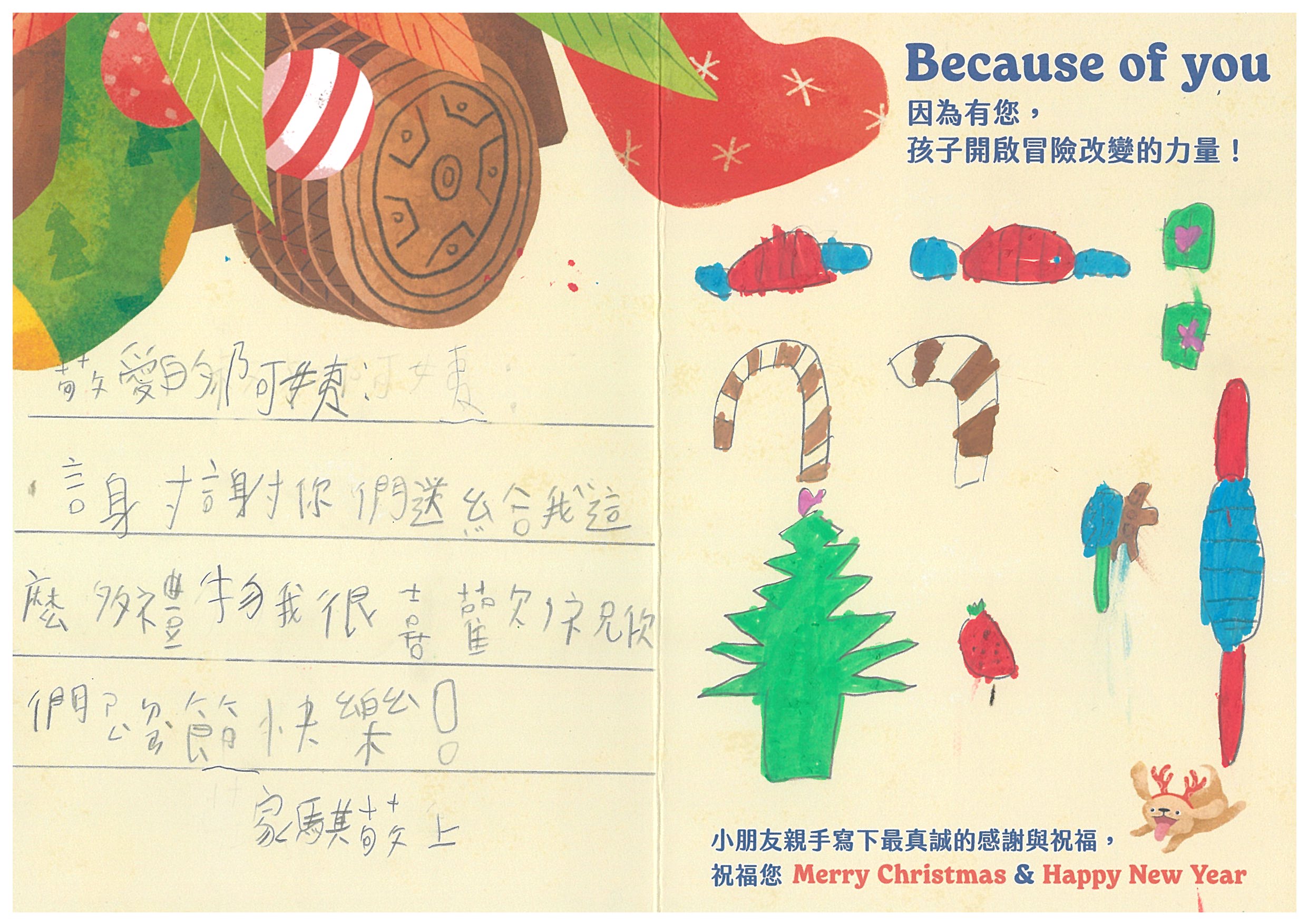 春伶 您好:我們已在12/6(六)已將禮物發送到孩子的手上嚕!在發送禮物前, 我們特別為孩子設計〈品格營〉及〈反思課程〉, 最後進行〈冒險小勇者聖誕挑戰賽〉,希望能讓孩子們從心裡面長出勇氣與自信。 特地將小朋友寫給您的感謝卡片掃描成圖檔,記錄這美好的時刻。先前已寄出到孩子寫給您的感謝卡片及我們小小心意的禮物:)