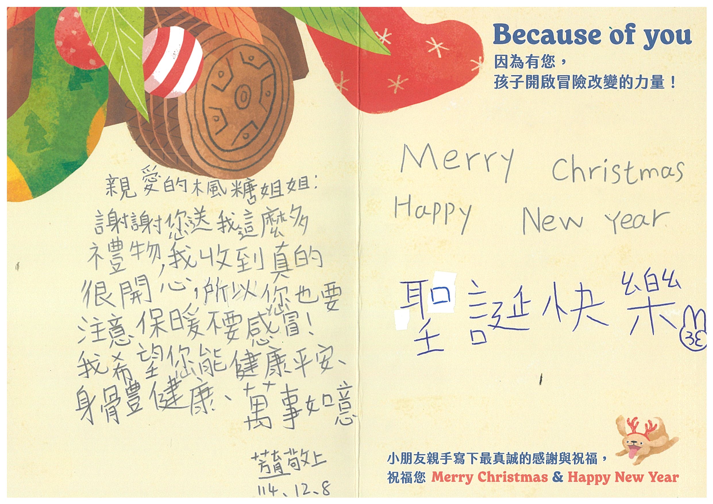 楓糖 您好:我們已在12/6(六)已將禮物發送到孩子的手上嚕!在發送禮物前, 我們特別為孩子設計〈品格營〉及〈反思課程〉, 最後進行〈冒險小勇者聖誕挑戰賽〉,希望能讓孩子們從心裡面長出勇氣與自信。 特地將小朋友寫給您的感謝卡片掃描成圖檔,記錄這美好的時刻。先前已寄出到孩子寫給您的感謝卡片及我們小小心意的禮物:)