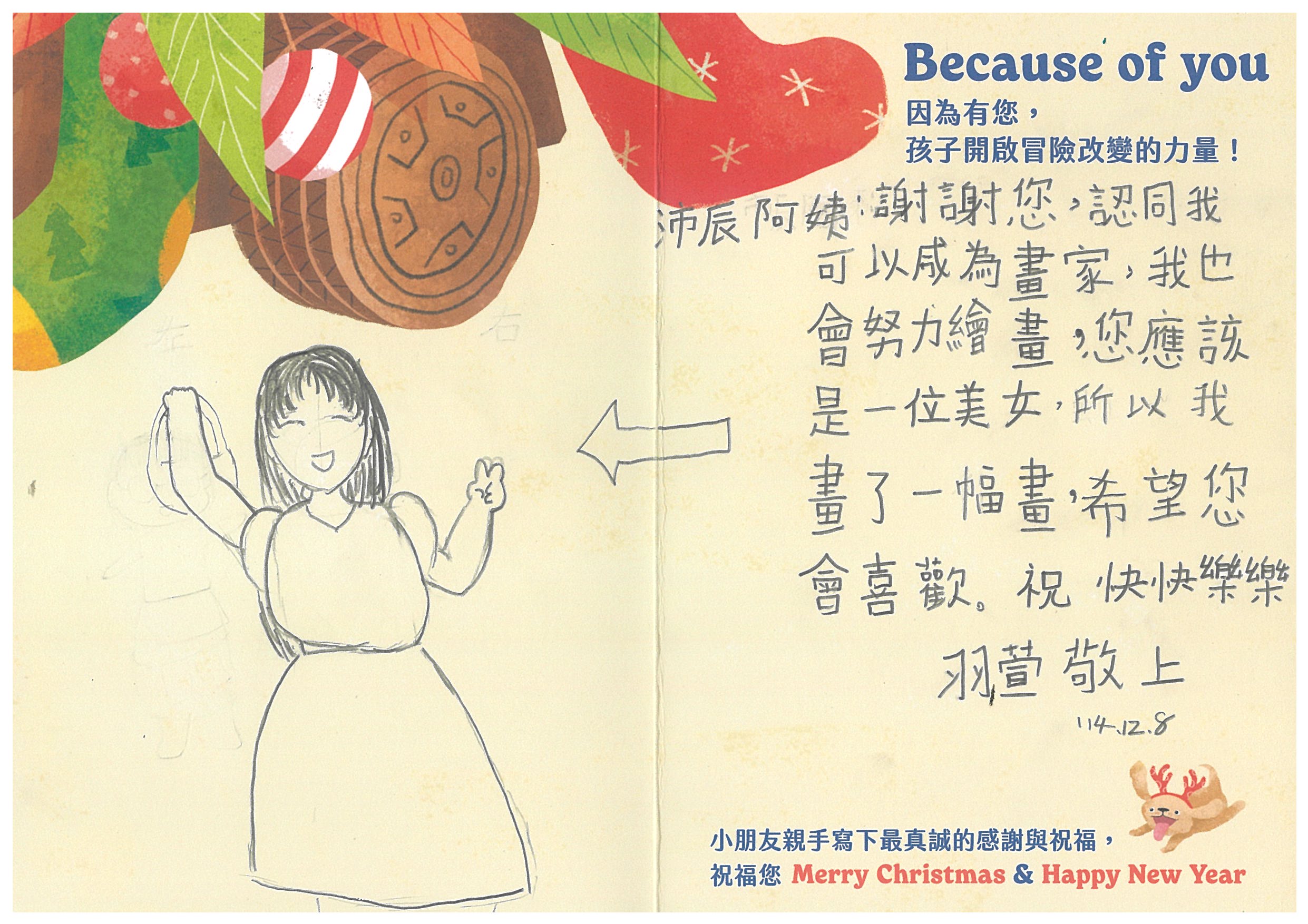 Ginny8N 您好:我們已在12/6(六)已將禮物發送到孩子的手上嚕!在發送禮物前, 我們特別為孩子設計〈品格營〉及〈反思課程〉, 最後進行〈冒險小勇者聖誕挑戰賽〉,希望能讓孩子們從心裡面長出勇氣與自信。 特地將小朋友寫給您的感謝卡片掃描成圖檔,記錄這美好的時刻。先前已寄出到孩子寫給您的感謝卡片及我們小小心意的禮物:)