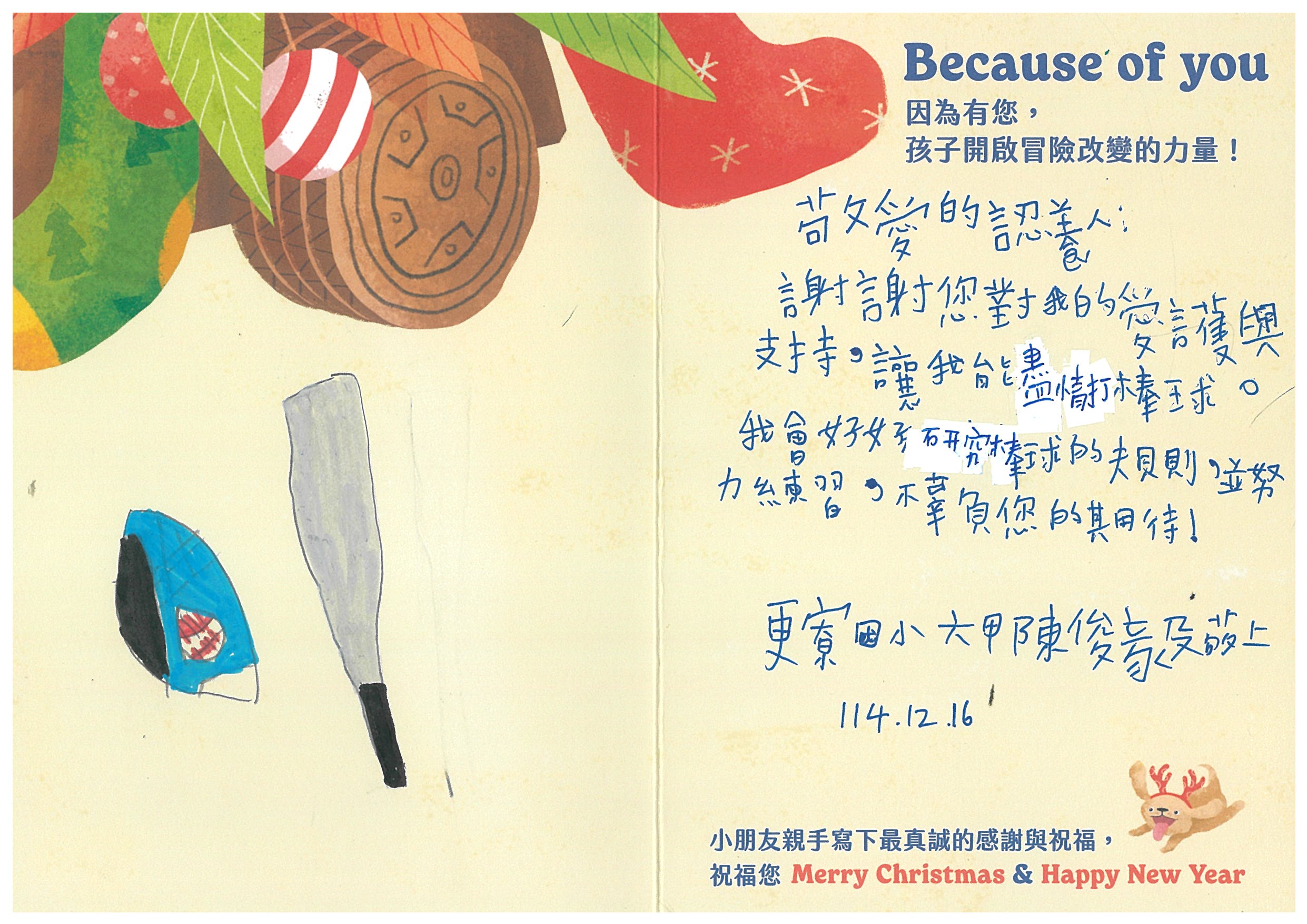 • 備註 長相很有大哥氣勢,高高壯壯的俊毅,目前家庭是隔代教養的情況,他的心願禮物想要有一套棒球棒、棒球還有棒球手套,讓他可以跟朋友打棒球,就不會在家裡一直玩手機