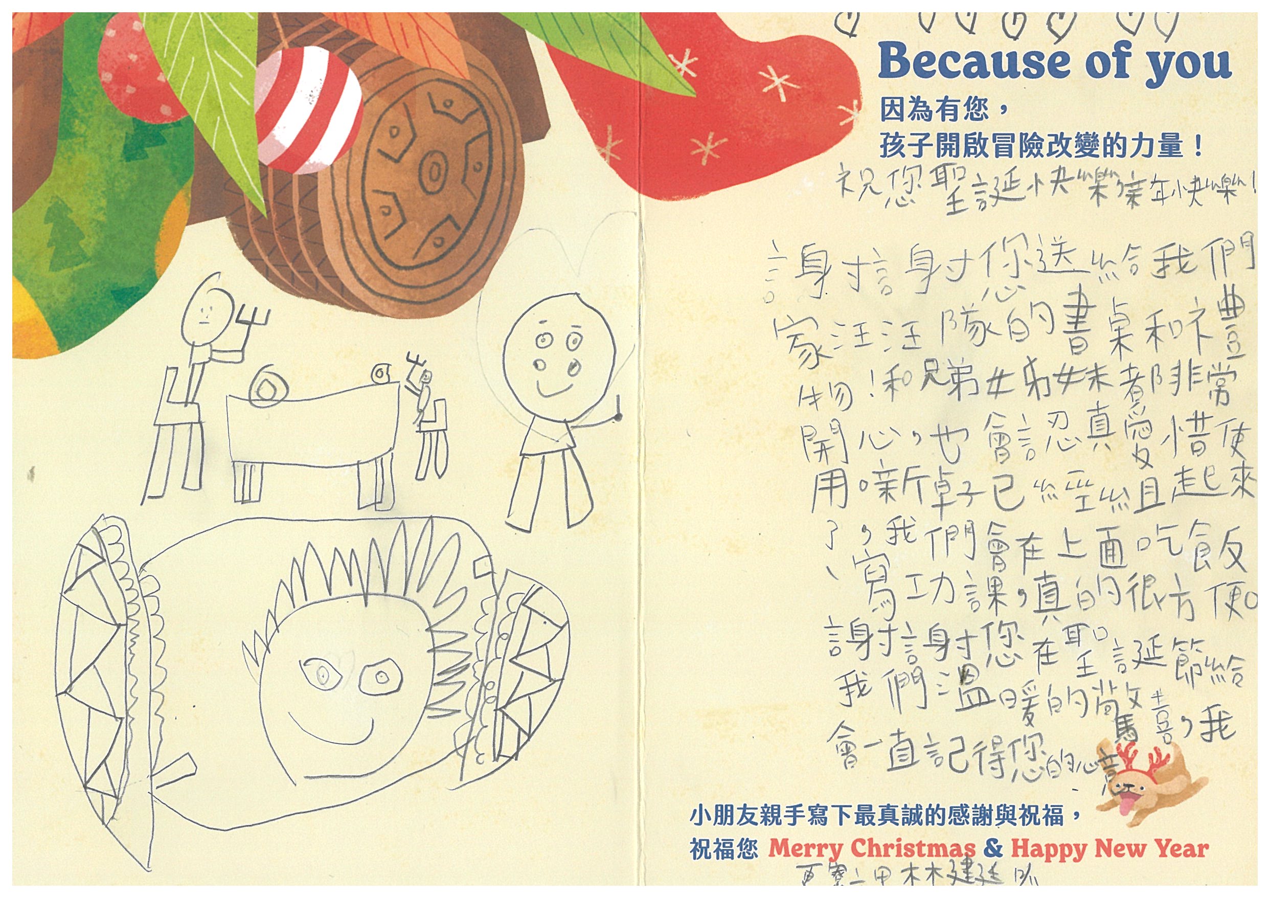 每份聖誕禮物內容:小朋友許下的心願禮物+親手寫下的鼓勵祝福卡片1張